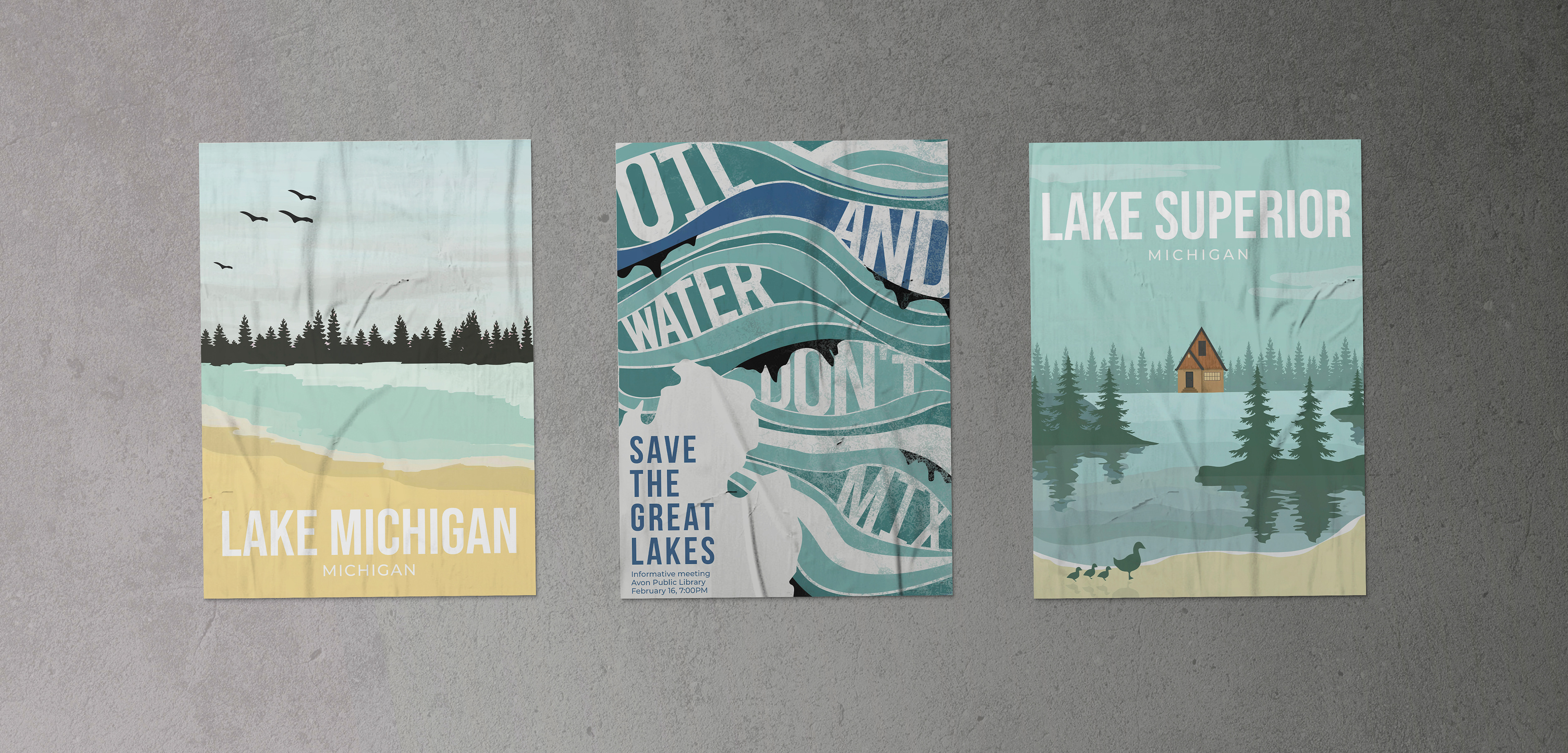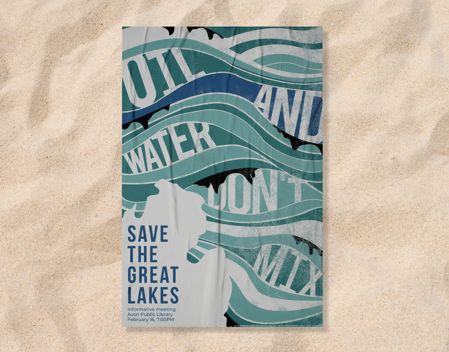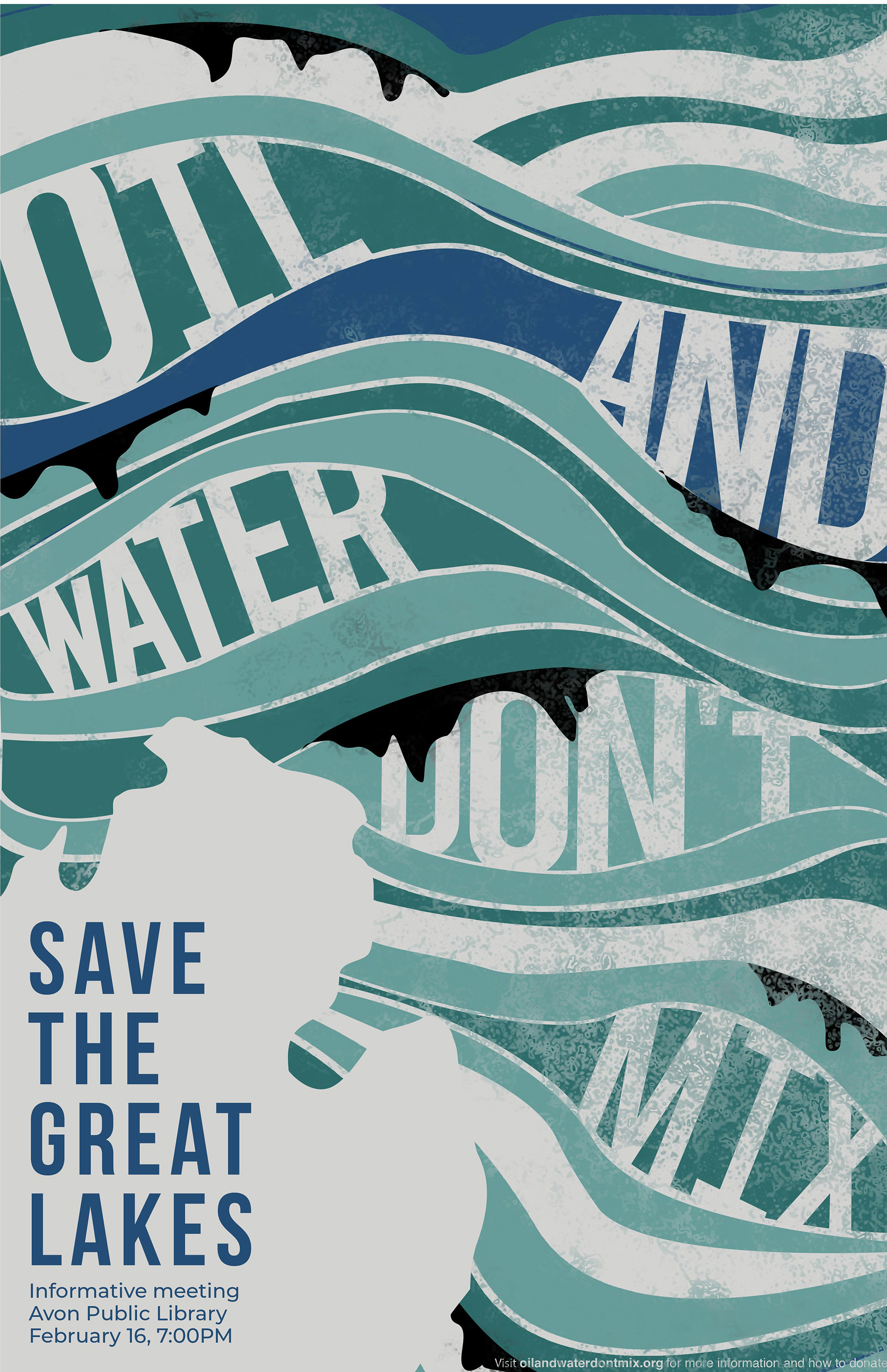 College class project to create posters about a current social issue. My focus is on the “Line 5” pipeline that runs through the Great Lakes. It carries millions of gallons of oil that are currently spilling into the fresh water every day.
